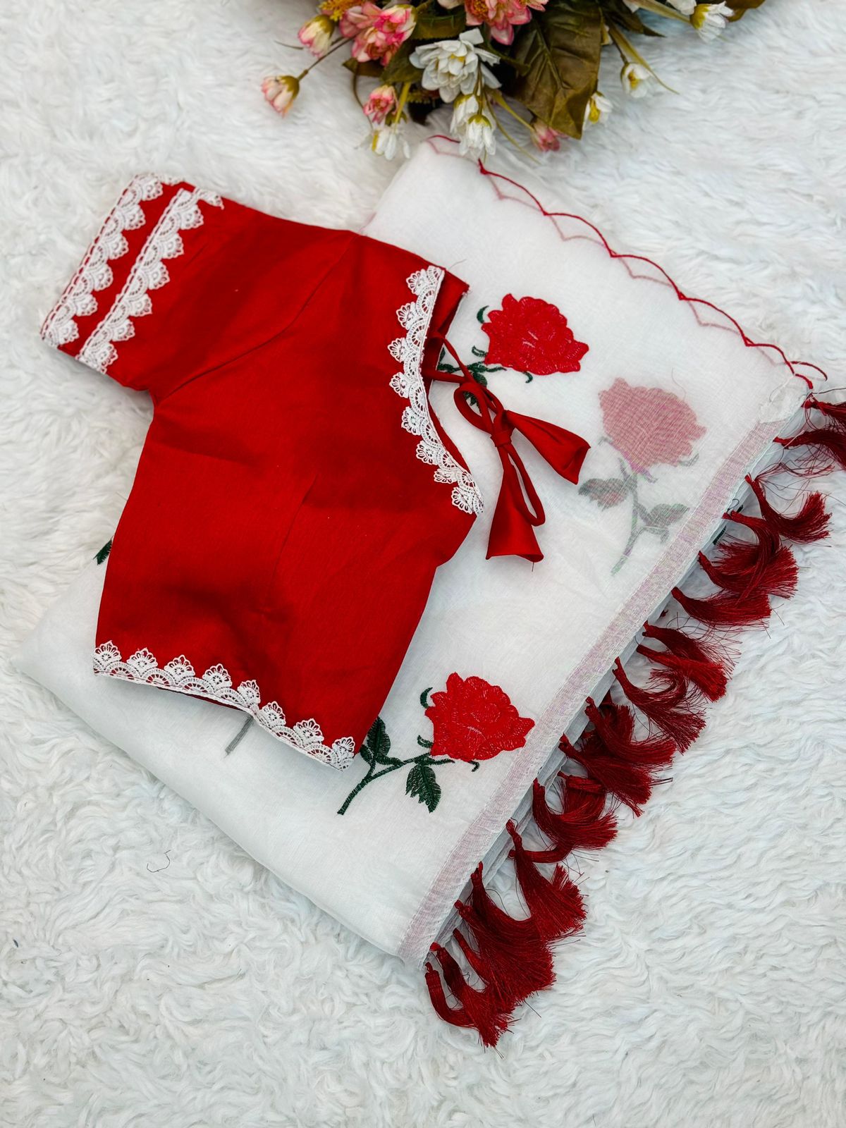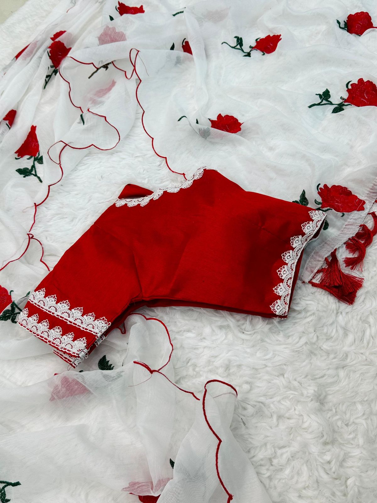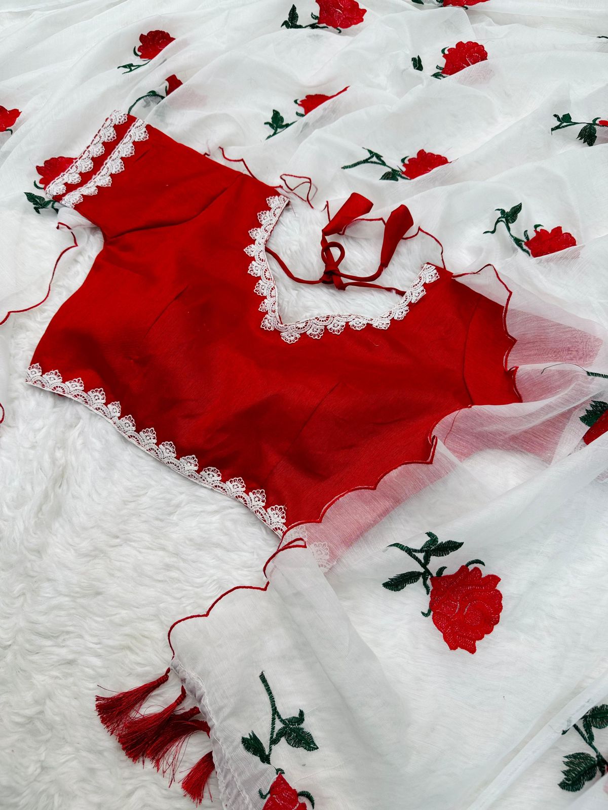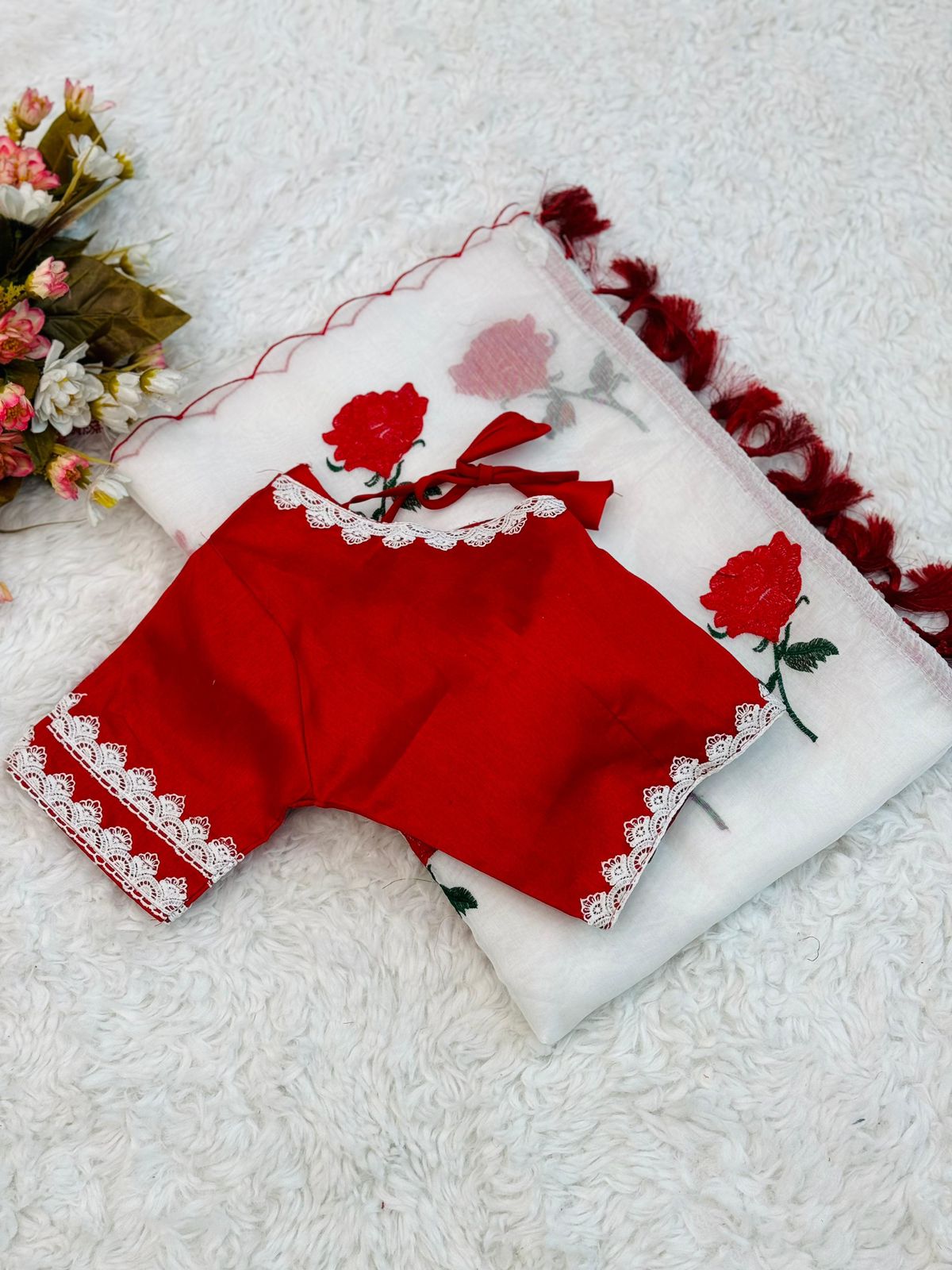 Saree fabric : Chanderi cotton with red rose threadwork and cutwork