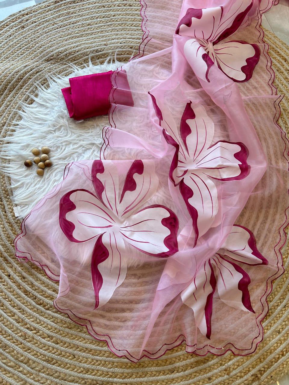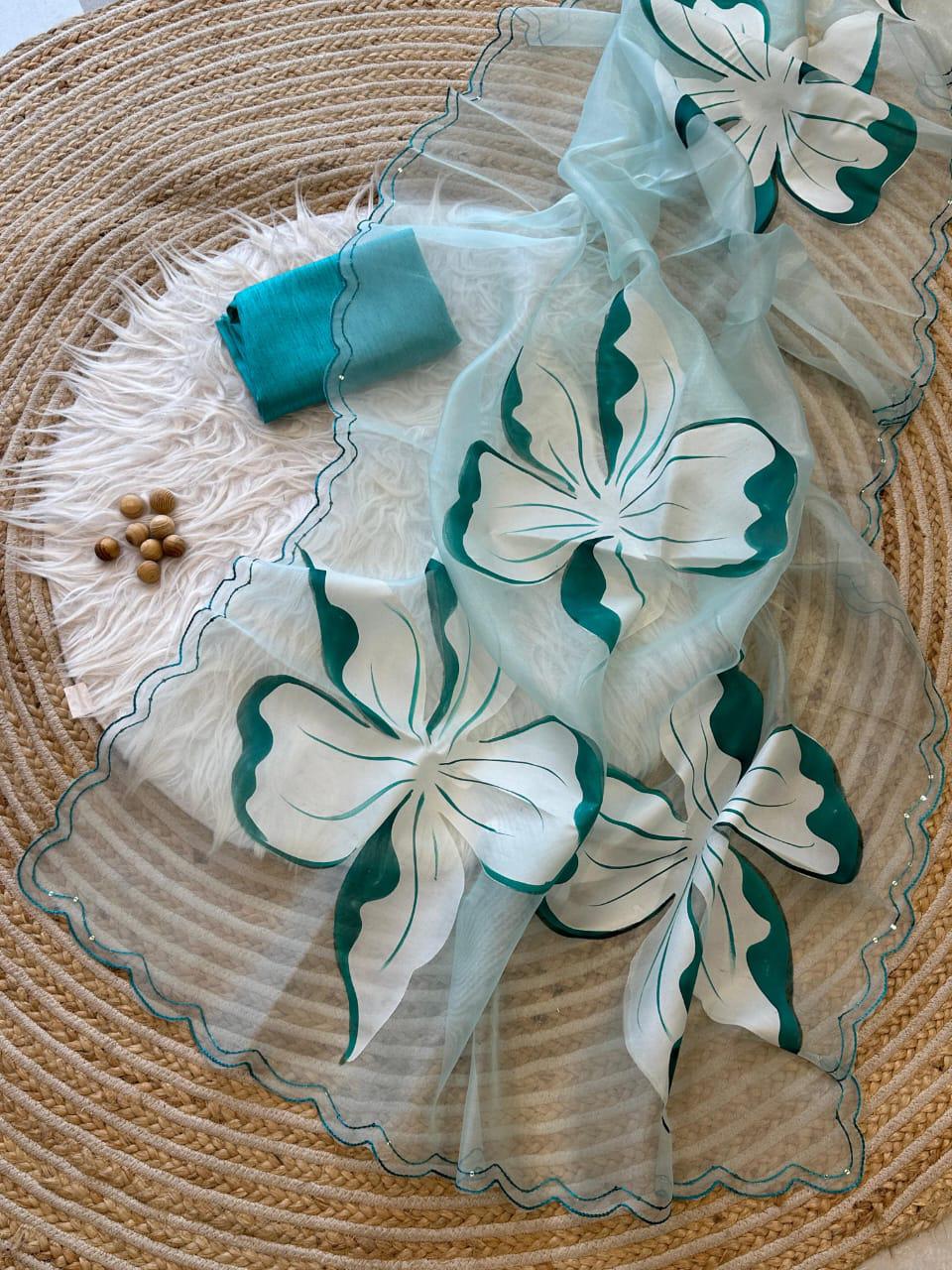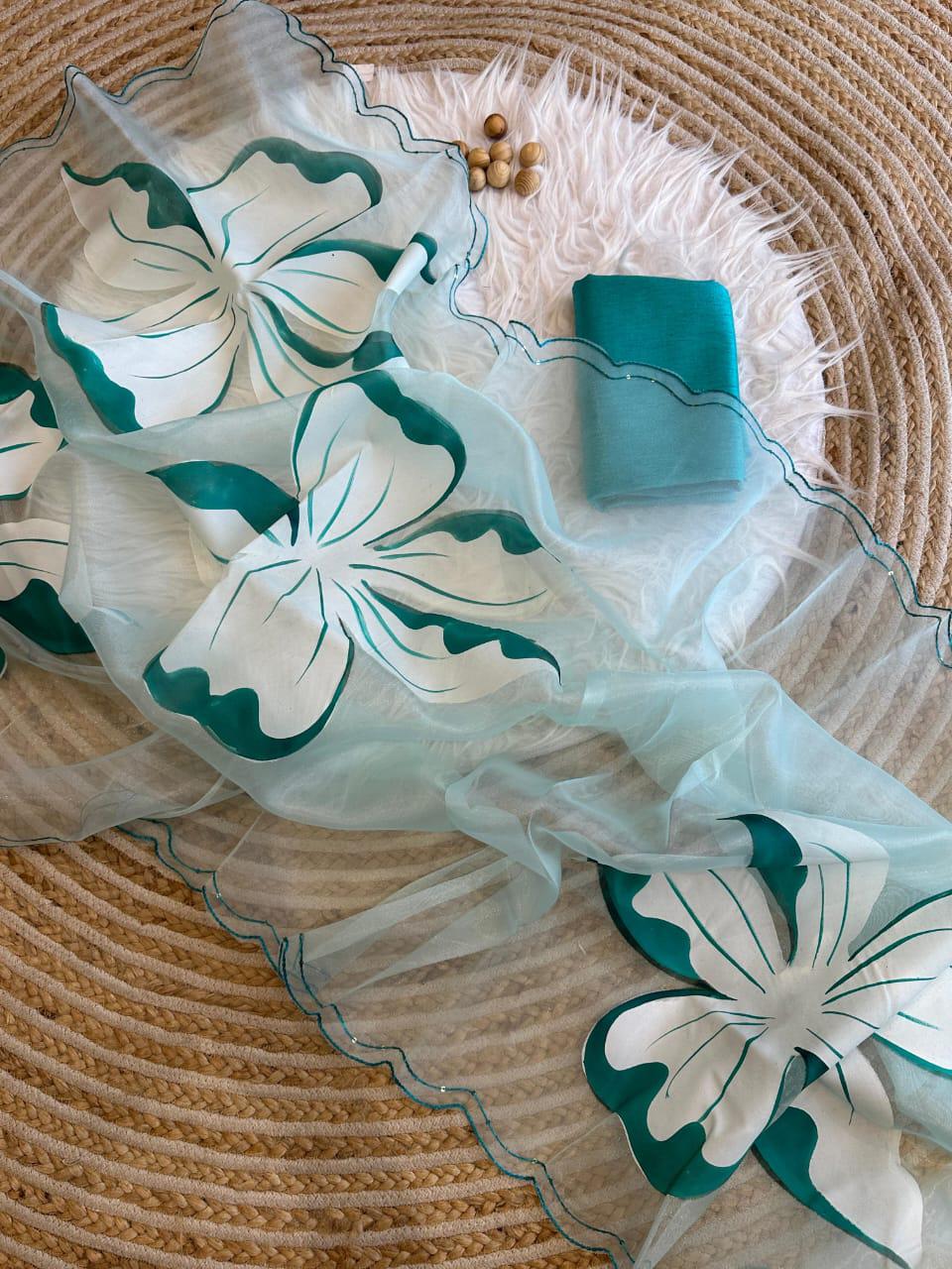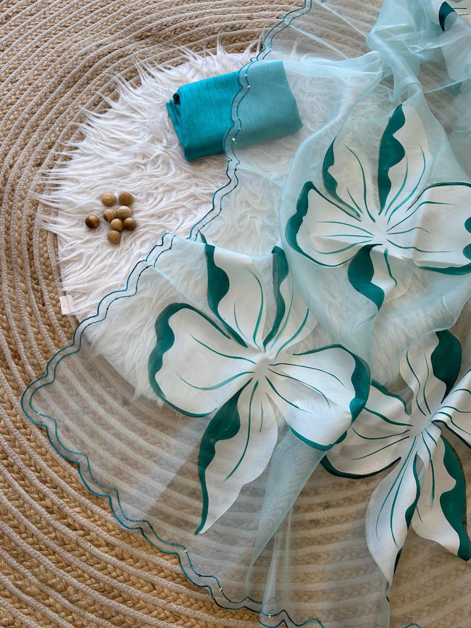 Fabric :- pure Organza silk Saree with beautiful handpainted flowers and sequins work on border